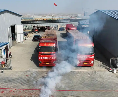 11月18日,在新疆墨玉县现代农业产业园鸿源农业科技开发有限公司种植基地内,两辆满载“老王长茄”的卡车鸣笛启程,驶向霍尔果斯口岸。这批蔬菜将出口至哈萨克斯坦、吉尔吉